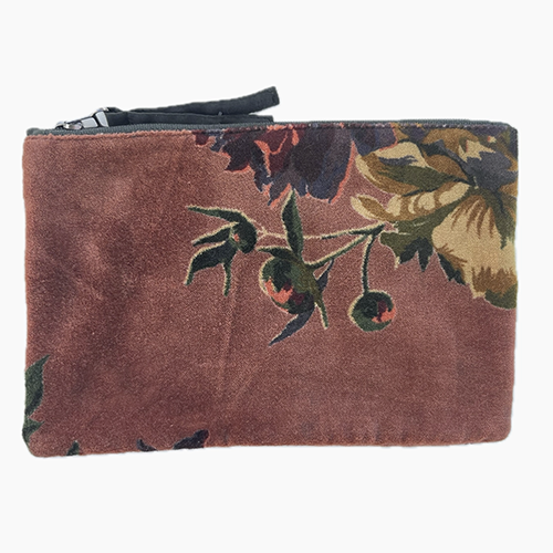 Soft Cotton Velvet, vibrant vintage floral.. A perfect keep-all to any day bag. Lined in 100% cotton voile with pull tab zipper. 7" x 5".