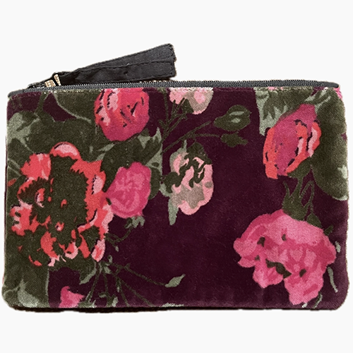 Soft Cotton Velvet, vibrant vintage floral.. A perfect keep-all to any day bag. Lined in 100% cotton voile with pull tab zipper.   7" x 5".