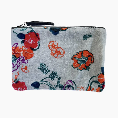 Soft Cotton Velvet, vibrant vintage floral.. A perfect keep-all to any day bag. Lined in 100% cotton voile with pull tab zipper.  7" x 5".