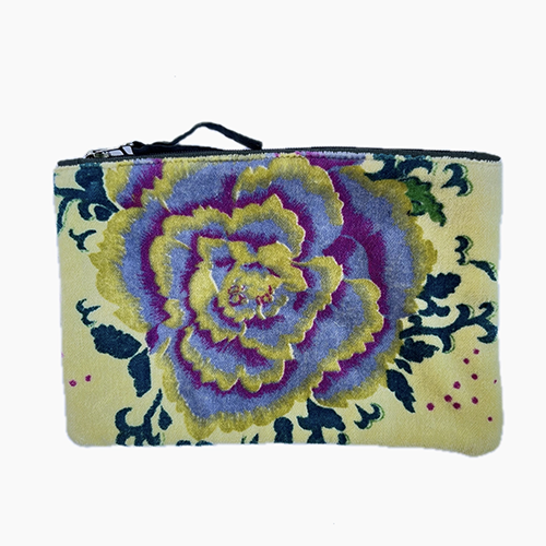 Soft Cotton Velvet, vibrant vintage floral.. A perfect keep-all to any day bag. Lined in 100% cotton voile with pull tab zipper. 7" x 5".