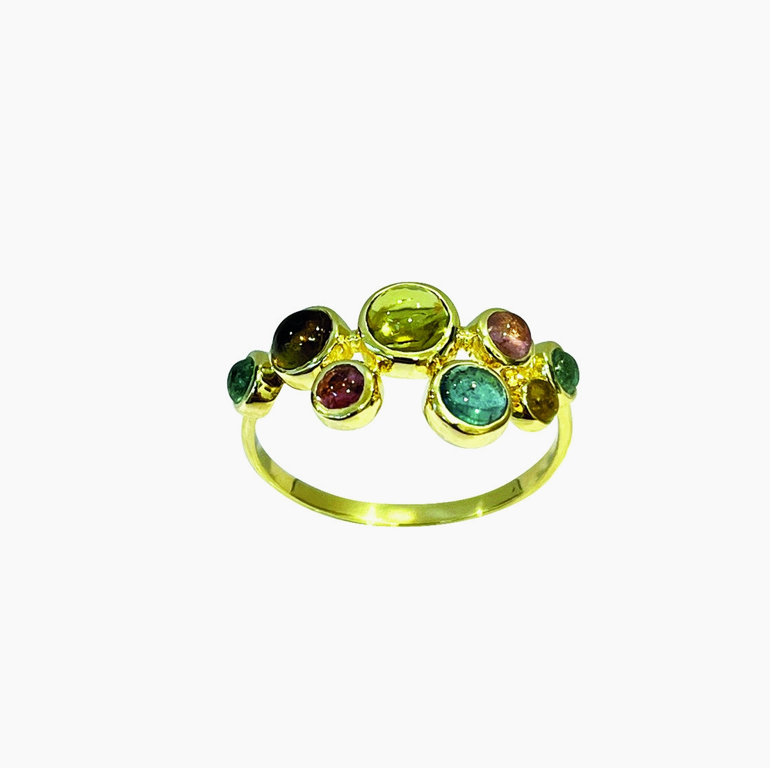 Joli petit cabochon qui compose cette bague en tourmaline de toutes les couleurs. Plaqué or 3 microns.