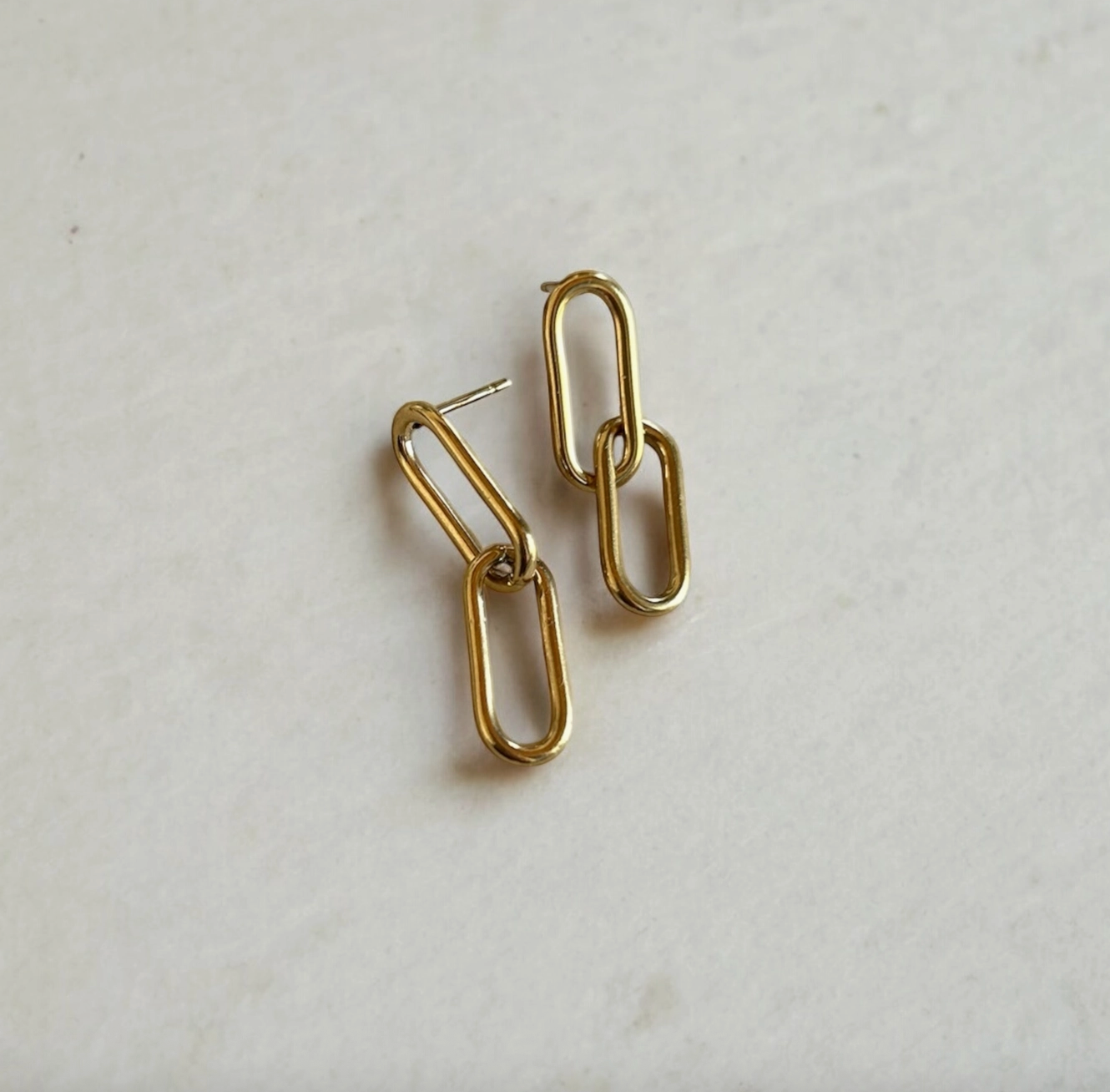 Our Lennox Paperclip Earrings are here to make a statement! Two intertwined gold elongated hoops create a sculptural, striking look that moves with you