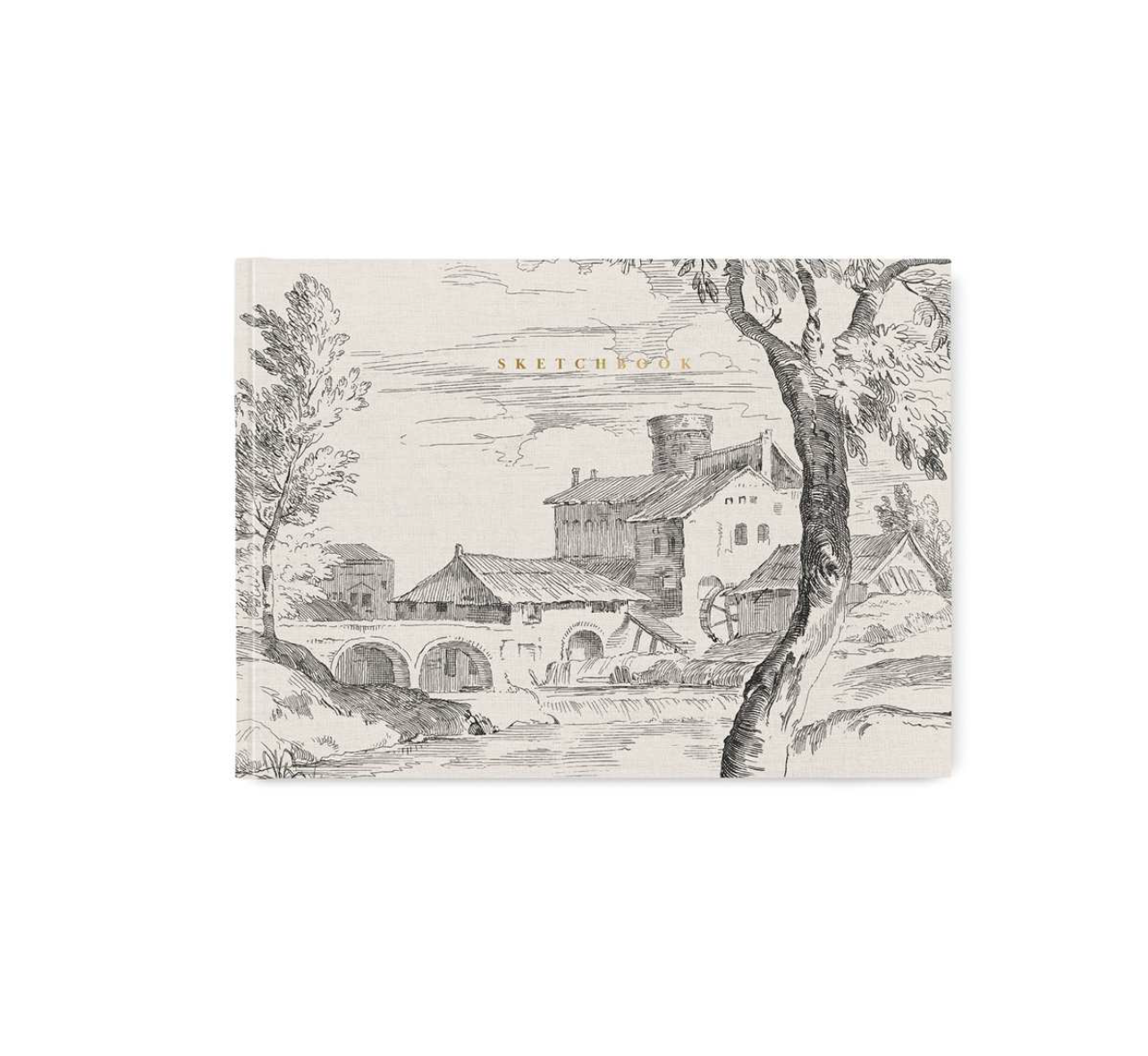 Designer sketchbook with flexible cover wrapped in book cloth, metallic gold foil accent, and bright white, quality drawing paper.